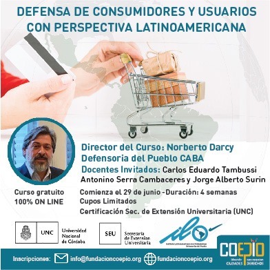 Curso totalmente online, a cargo del Dr. Norberto Darcy (Director del Área de Usuarios y Consumidores del ILO) Las temáticas que se abordan son elementos del derecho del consumidor, servicios públicos, el rol de las defensorías del pueblo, el derecho del consumidor como derecho humano. La certificación está a cargo del ILO y de la Secretaría de Extensión de la UNC.