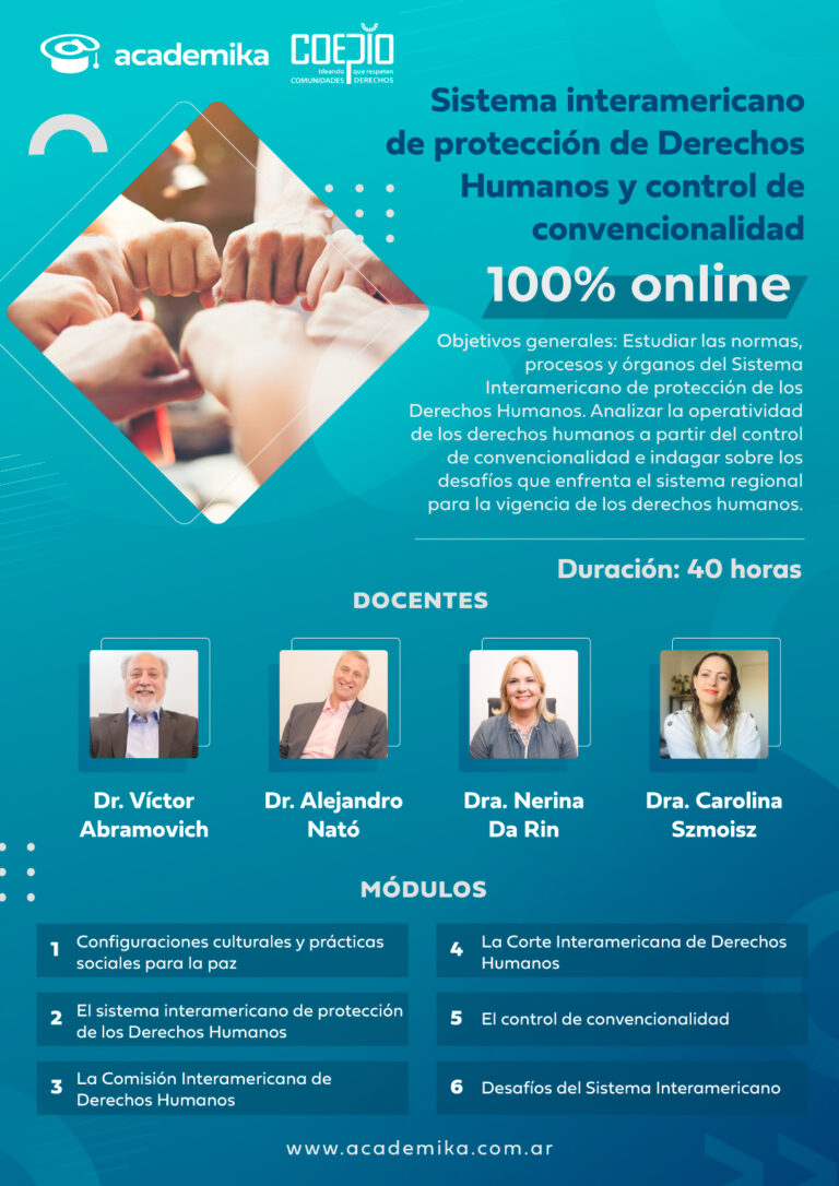 Estudiar las normas, procesos y órganos del Sistema Interamericano de protección de los Derechos Humanos. Profundizar el análisis de la operatividad de los Derechos Humanos a partir del control de convencionalidad, su aplicación en los ordenamientos jurídicos internos de los Estados parte y los desafíos que enfrenta el Sistema regional y la comunidad internacional, para la efectiva vigencia de los Derechos Humanos.